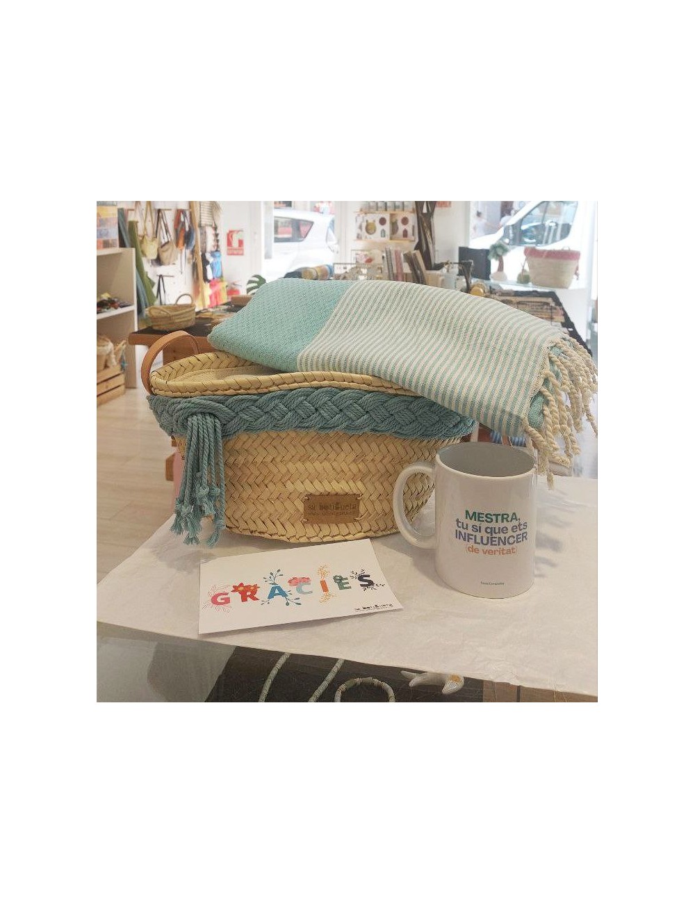 El conjunt consta d'un cabàs trena amb tancament cremallera 38€, tassa amb missatge 16€ i tovallola 22€.