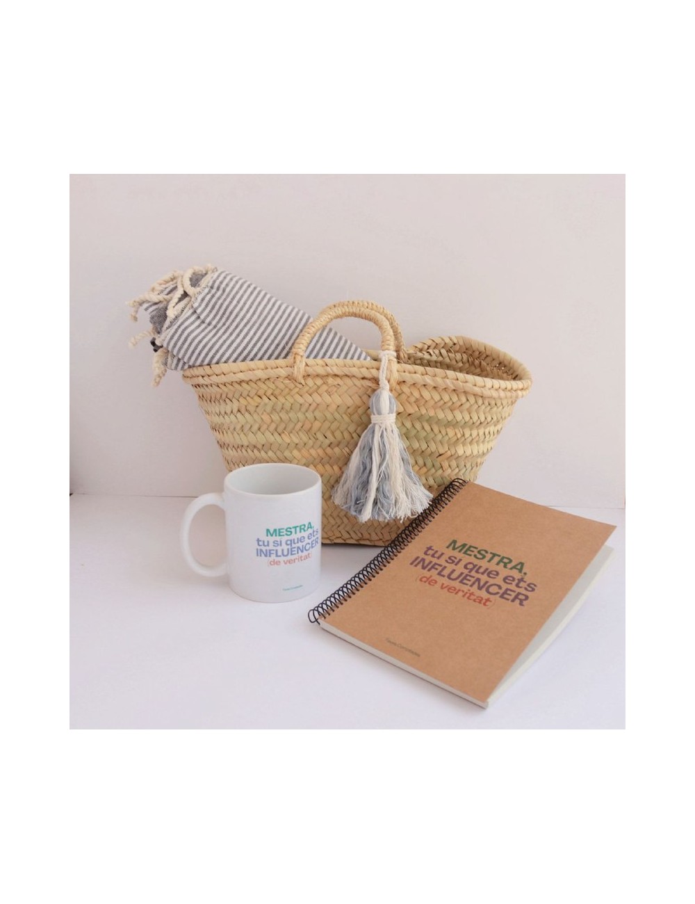 El conjunt consta d'un cabàs mini amb pompom i tovallola 37€, tassa amb missatge 16€ i llibreta frase 11€.